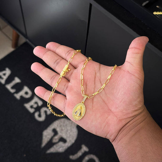 Corrente Meia Cana 4mm e Pingente N. Sra. Aparecida Oval Banhado a Ouro 18K