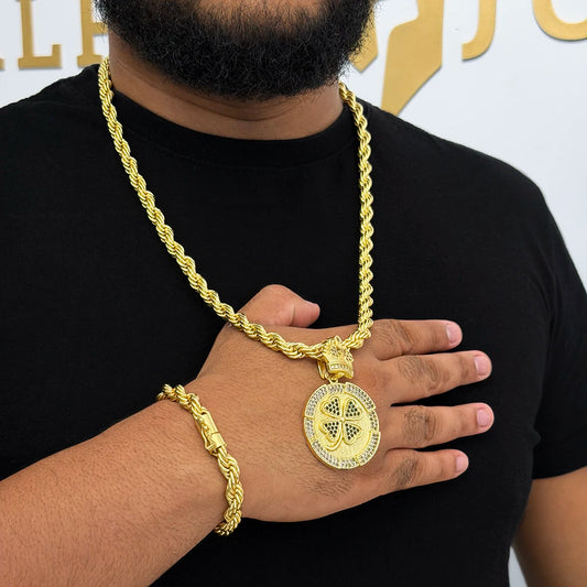 Kit Corrente e Pulseira Baiana 10mm e Pingente Trevo Banhado a Ouro 18K
