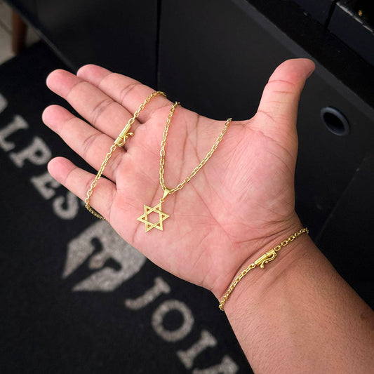 Kit Corrente e Pulseira Cadeado 2mm e Pingente Estrela de Davi Banhado a Ouro 18K