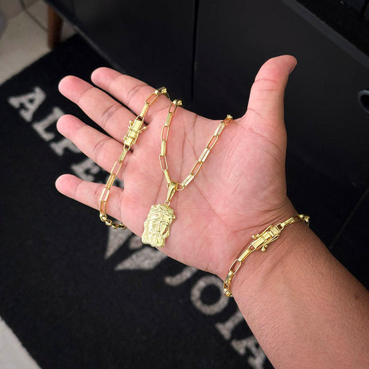 Kit Corrente e Pulseira Elo Alongado 5mm e Pingente Face de Jesus Banhado a Ouro 18K