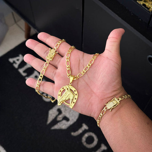 Kit Corrente e Pulseira 1x1 5mm e Pingente Cavalo Ferradura Banhado a Ouro 18K