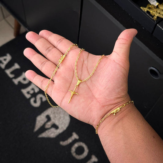 Kit Corrente e Pulseira Cadeado Alongado 3mm e Pingente Cruz Amarrada Banhado a Ouro 18K
