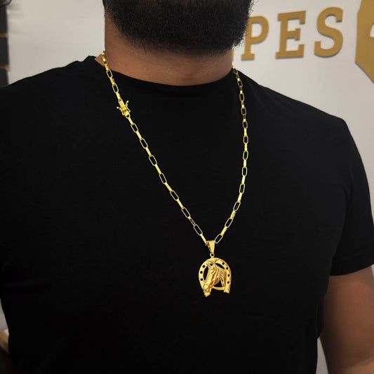 Corrente Meia Cana Dupla 6mm e Pingente Cavalo Ferradura Banhado a Ouro 18K