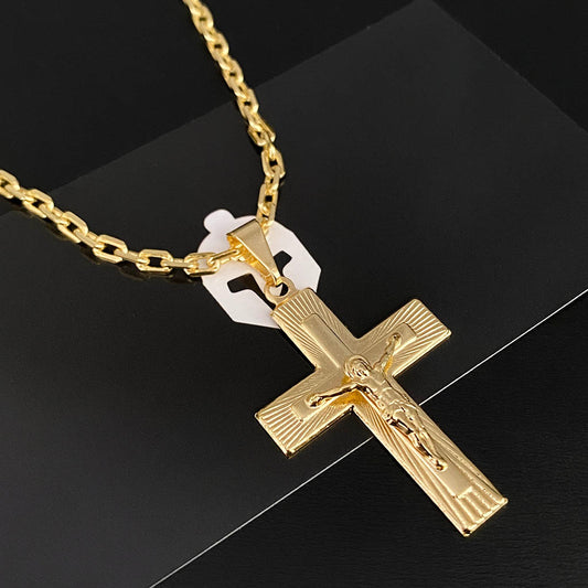 Corrente Cadeado Alongado 3mm e Pingente Cruz Relevo Banhado a Ouro 18K