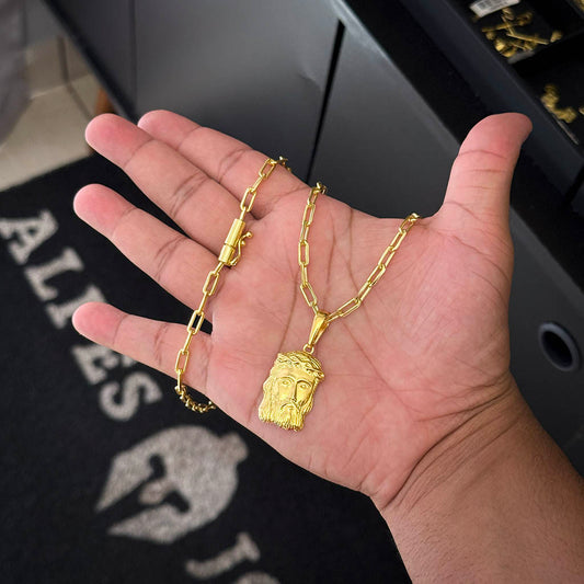 Corrente Cadeado Alongado 4mm e Pingente Face de Jesus Banhado a Ouro 18K