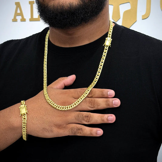 Kit Corrente e Pulseira Maciça 10mm Banhado a Ouro 18K