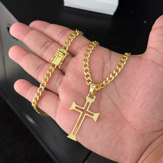 Corrente Cubana 6mm e Pingente Cruz Ponta Banhado a Ouro 18K