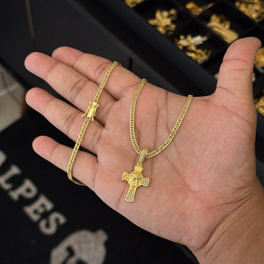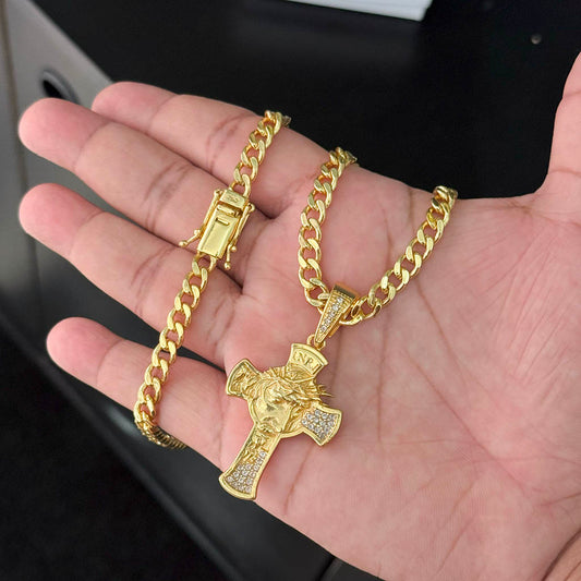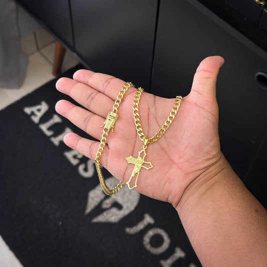Corrente Cubana 6mm e Pingente Cruz Cravejada com Rosto de Cristo Banhado a Ouro 18K