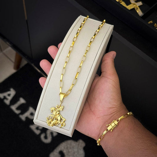 Kit Corrente e Pulseira Elo Alongado 5mm e Pingente São Jorge Banhado a Ouro 18K