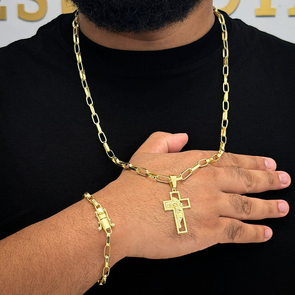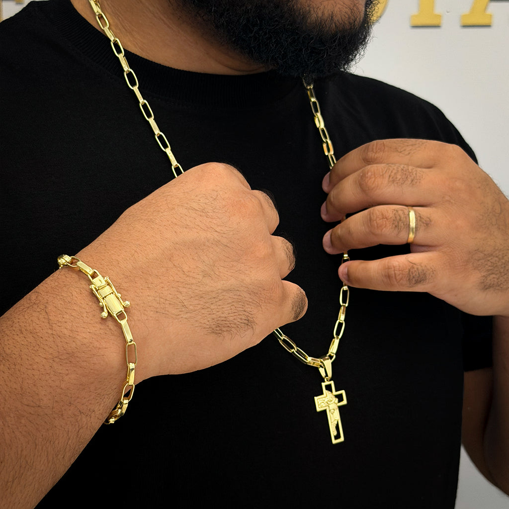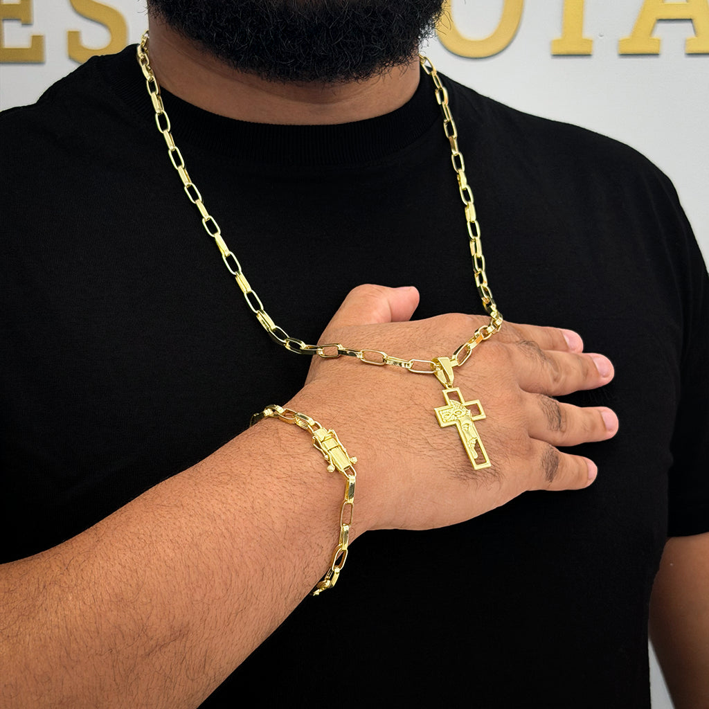Kit Corrente e Pulseira Elo Alongado 5mm e Pingente Cruz Rosto Banhado a Ouro 18K